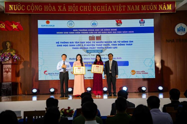 Tiếp nối thành công từ Cuộc thi các năm trước, Trường Đại học Đồng Tháp tiếp tục khẳng định vị thế trong hoạt động nghiên cứu khoa học của sinh viên với 01 đề tài đạt giải Nhì ở lĩnh vực Khoa học giáo dục. Đề tài mang tên “Hệ thống bài tập dạy học từ nhiều nghĩa và từ đồng âm cho học sinh lớp 5 ở huyện Tháp Mười, tỉnh Đồng Tháp theo hướng phát triển năng lực” do nhóm sinh viên Phạm Như Ý và Trần Thị Ngọc Trâm (ngành Giáo dục Tiểu học) thực hiện, dưới sự hướng dẫn của Tiến sĩ Trần Hoàng Anh – giảng viên Khoa Giáo dục Tiểu học - Mầm non, Trường Sư phạm, Trường Đại học Đồng Tháp. Đặc biệt, đây là lần thứ ba, Tiến sĩ Trần Hoàng Anh hướng dẫn sinh viên thực hiện đề tài nghiên cứu khoa học được chọn vào Vòng Chung khảo và đạt giải Nhì tại Giải thưởng Khoa học và Công nghệ cấp Bộ. Điều này, minh chứng cho sự tâm huyết, năng lực nghiên cứu và tinh thần đồng hành cùng sinh viên trong hoạt động nghiên cứu khoa học của Tiến sĩ Trần Hoàng Anh nói riêng và các giảng viên của Trường Đại học Đồng Tháp nói chung.