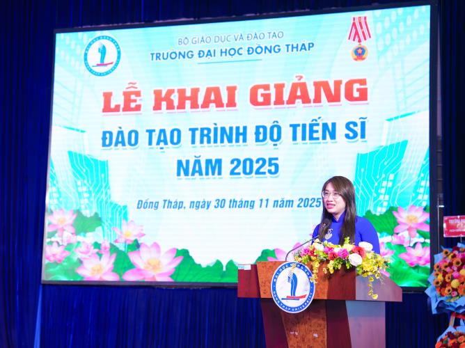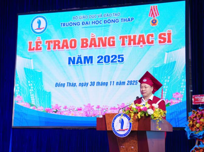 Phát biểu tại lễ khai giảng, PGS.TS Hồ Văn Thống – Hiệu trưởng Nhà trường chia sẻ: “Trường Đại học Đồng Tháp với mục tiêu đào tạo nhân lực, bồi dưỡng nhân tài, cống hiến tri thức cho sự phát triển đất nước và khu vực. Với hơn 50 năm truyền thống đào tạo giáo viên và cán bộ quản lý giáo dục, hơn 20 năm triển khai đào tạo đại học đa ngành, cùng 13 năm đào tạo Thạc sĩ và 6 năm đào tạo Tiến sĩ, Nhà trường tiếp tục khẳng định vị thế là trung tâm đào tạo, nghiên cứu và đổi mới sáng tạo uy tín trong nước và khu vực Đông Nam Á. Hôm nay, chúng tôi chúc mừng 84 học viên khóa 11 và 12 đã hoàn thành chương trình cao học, được vinh danh với tấm bằng Thạc sĩ – kết quả của nỗ lực, phấn đấu và cả những hy sinh thầm lặng. Chúc các nghiên cứu sinh giữ vững ngọn lửa đam mê để gặt hái nhiều thành tựu khoa học trong tương lai.”