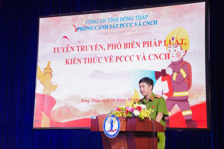 Đại úy Lê Hoàng Khang - cán bộ Đội chữa cháy và cứu nạn cứu hộ khu vực Cao Lãnh báo cáo chuyên đề.