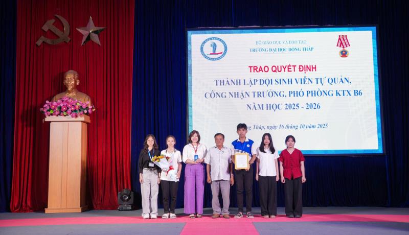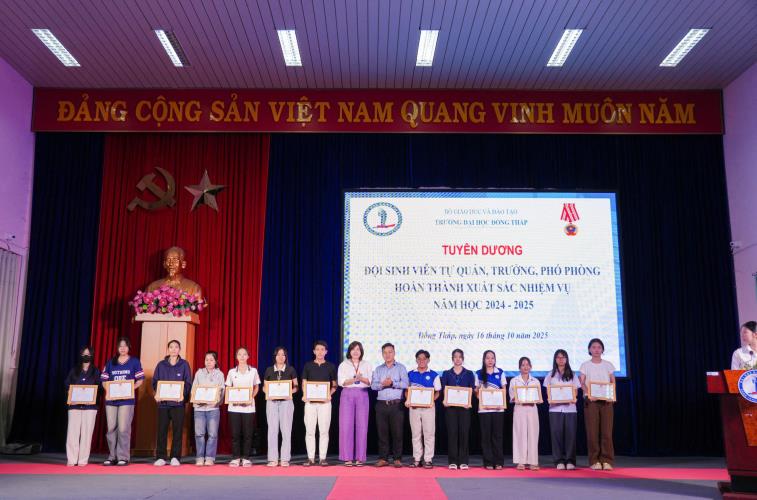 Dịp này, Trường Đại học Đồng Tháp tuyên dương 16 cá nhân thuộc Đội Sinh viên tự quản và các Trưởng, Phó phòng ký túc xá đã hoàn thành xuất sắc nhiệm vụ năm học 2024–2025. Đồng thời, Trung tâm Dịch vụ phối hợp cùng các đơn vị liên quan kiện toàn Đội Sinh viên tự quản, công nhận Trưởng, Phó phòng tại Ký túc xá B6 và Khu nhà ở sinh viên Phường 6, phát huy tinh thần trách nhiệm và gắn kết trong công tác quản lý, hỗ trợ sinh viên.