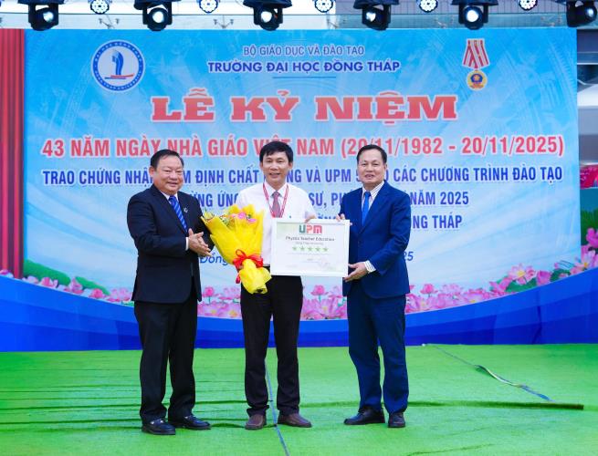 Nhà giáo Nhân dân, GS.TS Nguyễn Hữu Đức – nguyên Phó Giám đốc ĐHQG Hà Nội, Ủy viên Hội đồng Giáo sư Nhà nước, Chủ tịch Hội đồng Giáo sư ngành Vật lý, Chuyên gia UPM (bìa phải) trao chứng nhận; PGS.TS Hồ Văn Thống – Hiệu trưởng Trường Đại học Đồng Tháp (bìa trái) tặng hoa chúc mừng các chương trình đạt chuẩn 5 sao ứng dụng UPM.