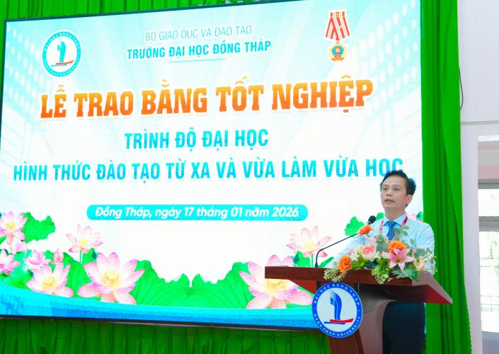 Phát biểu tại buổi lễ, TS. Nguyễn Quốc Vũ – Phó Hiệu trưởng Trường Đại học Đồng Tháp nhấn mạnh, Nhà trường luôn xác định người học là trung tâm của mọi hoạt động đào tạo; không ngừng đổi mới nội dung, phương pháp giảng dạy, đẩy mạnh ứng dụng công nghệ thông tin và nâng cao chất lượng đội ngũ giảng viên đối với các chương trình đào tạo từ xa và vừa làm vừa học. Nhà trường luôn đồng hành, hỗ trợ học viên trong suốt quá trình học tập, giúp người học hoàn thành chương trình đúng tiến độ, đúng chuẩn đầu ra, qua đó khẳng định chất lượng và hiệu quả công tác đào tạo.